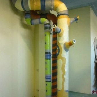 بالإضافة إلى ذلك ، هناك تقنيات زخرفية أخرى للتجديد البصري للفضاء. على سبيل المثال ، ليس من الضروري إخفاء الأنابيب لهذا الغرض على الإطلاق. يمكن تزيينها بـ التصميم الإبداعي. يمكن أن تختلف تقنيات الديكور بشكل كبير عن بعضها البعض..
