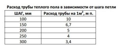 في معظم الحالات ، يتم استهلاك 5 أمتار من الأنابيب لكل متر مربع. في هذه الحالة ، طول الخطوة هو 20 سم.