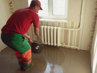 إذا قررت إجراء التثبيت بنفسك ، ولكن ليس لديك خبرة كافية ، فمن المستحسن استخدام خليط خشن جاهز ذاتي التسوية ، لأن الكتلة كبيرة. إنها مستلقية بدون مساعدة إضافية. هذه الطريقة مناسبة لملء أرضية الشقق..