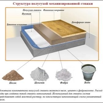 لعمل ذراع تسوية شبه جاف ، تحتاج إلى اختيار سلسلة خاصة من الخرسانة والرمل. تحقق لمعرفة ما إذا كانت الشركة المصنعة تستخدمهم في إجراءات التخشين. ولا يهم هنا ما إذا كنت تريد صنع ماء دافئ أو أرضية كهربائية. يتكيف هذا المزيج جيدًا مع التغيرات في درجات الحرارة ، وهو مستقر ، وهذه هي المزايا الرئيسية.