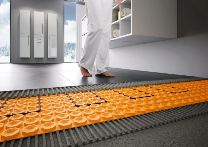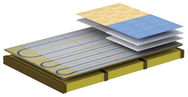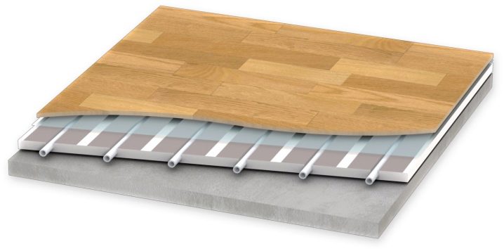 الهيكل العام لأرضية الماء بسيط للغاية وهو عبارة عن نظام من الأنابيب المعدنية أو البلاستيكية التي يتحرك من خلالها الماء الساخن. تم وضع الهيكل نفسه في ذراع التسوية الأسمنتي الخرساني ، ويتم التحكم باستخدام مستشعرات مساعدة ومتشعب منظم للحرارة.