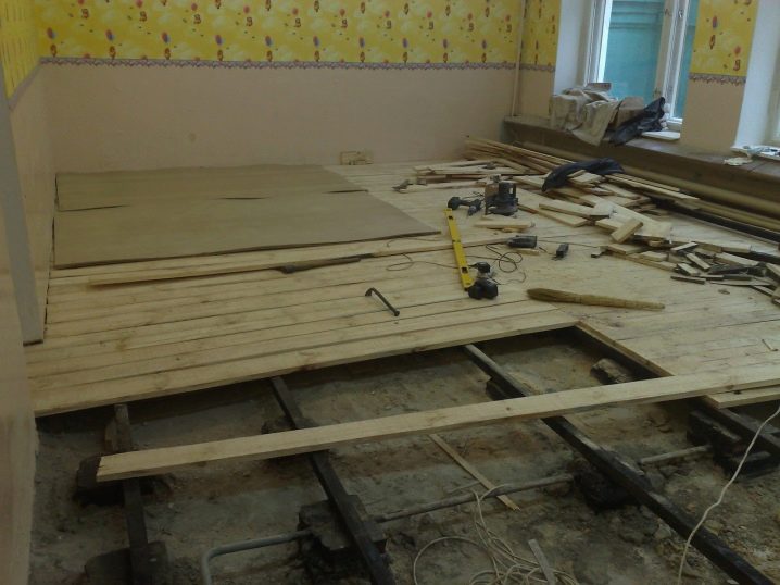 إذا كانت الأرضية بحاجة إلى الإصلاح ، تتم إزالة المعطف الخفيف البالي ، وفحص حالة الركيزة ، وإذا لزم الأمر ، إصلاحها. يجب استبدال التأخيرات المعيبة ، مثل المكونات الأخرى للقاعدة ، المتأثرة بالتعفن أو الفطريات. أثناء إصلاح الأرضيات ، يتم تغيير العزل الرطب أو المتكتل ، وكذلك العزل.