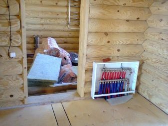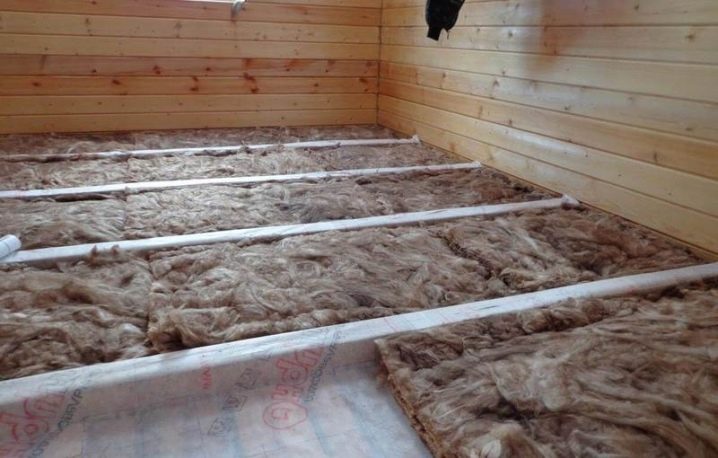 السجلات مغطاة بألواح يوضع عليها غشاء ، مما يمنع تغلغل الرياح والرطوبة في الغرفة. يتم وضع العزل في الخلايا المشكلة. اعتمادًا على الطريقة المختارة ، يمكن أن تكون إما من الطين الممدد أو البوليسترين أو البولي إيثيلين الرغوي أو الصوف المعدني. يتم تغطية العزل بحاجز بخار. تعتمد الإجراءات الإضافية على تفضيلات أصحاب المنزل. يمكن استخدام أي خيارات متاحة كأرضية تشطيب ، بما في ذلك الأرضيات التي يتم تسخينها بالماء..