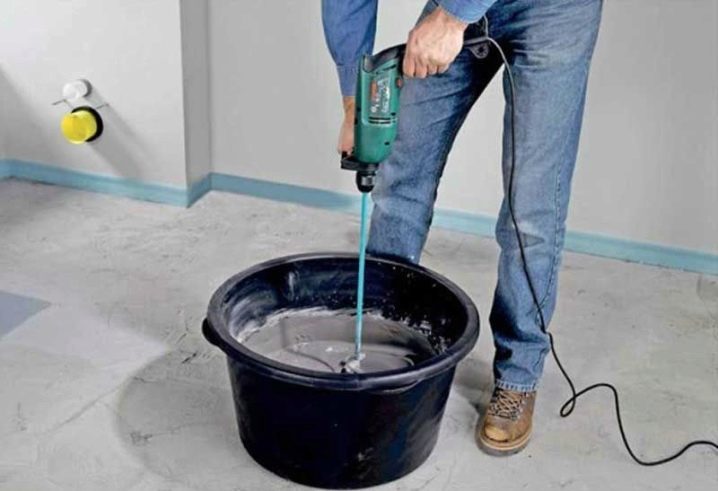 تم إعداد ملاط لتركيب أرضيات التسوية الذاتية وفقًا لتعليمات الشركة الصانعة بدقة. عادةً ما يتطلب 25 كجم من المادة الجافة حوالي سبعة لترات من الماء. أولا ، صب الخليط في وعاء الخلط ، ثم أضف الكمية المطلوبة من الماء. بعد ذلك ، باستخدام الخلاط ، يتم تحضير خليط متجانس لصب الأرضية. يحرك بسرعة بطيئة لمدة 5 دقائق على الأقل. يُترك الخليط بعد ذلك حتى يستقر لمدة 5 دقائق ويقلب مرة أخرى لمدة 3 دقائق. بعد ذلك ، يذهبون إلى العمل..