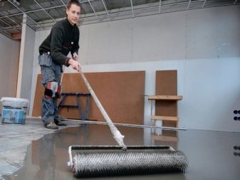 أثناء العمل ، من المهم التأكد من عدم وجود مسودات في الغرفة ، وأن درجة حرارة القاعدة المراد تسويتها لا تقل عن 5-10 درجات. بعد الملء ، تتم إزالة الهواء من المحلول باستخدام بكرة تهوية ذات مقبض طويل.
