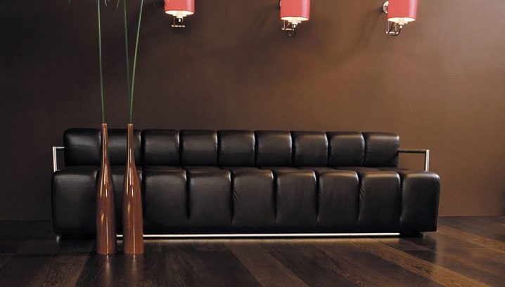 في غرفة المعيشة مع صفيحة الشوكولاتة الداكنة والجدران الغنية باللون البني المحمر ، ستبدو الأريكة الجلدية السوداء مثيرة للاهتمام. قد يبدو هذا المزيج قاتمًا للغاية ، لذا يجب تخفيفه بمصابيح الحائط الحمراء بأسلوب حديث والنباتات الحية في مزهريات زجاجية بلون الشوكولاتة..