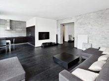 - بوجود أرضيات مظلمة في الغرفة ، يمكنك اللعب بفعالية مع التناقضات ، وتشكيل مجموعات أصلية. على سبيل المثال ، على خلفية صفائح الشوكولاتة الداكنة ، سيبرز الأثاث الحديث على إطار من الكروم مع تنجيد أبيض ثلجي بشكل فعال. لا يتم تجاهل مثل هذه التناقضات أبدًا وتبدو مثيرة جدًا للاهتمام..