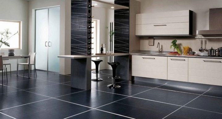 سيكون البلاط الأزرق الداكن الكبير مع خطوط من المفاصل البيضاء هو الحل الأمثل للمطبخ الحديث. في مثل هذه الغرفة ، ستجد مكانًا خفيفًا ومقتضبًا بأشكال زاويّة منتظمة ، ومنضدة بار ذات تفاصيل جانبية داكنة وكراسي سوداء لامعة ، بالإضافة إلى طاولة وكراسي بألوان كريمية..