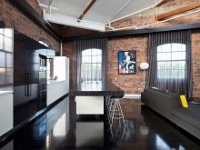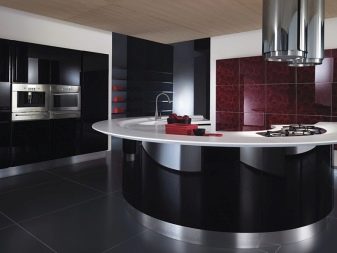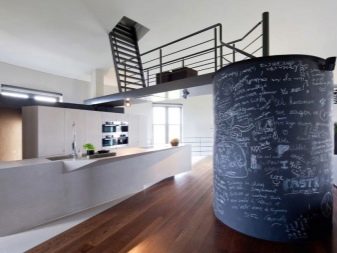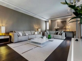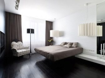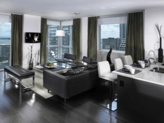 كقاعدة عامة ، يوجد في مثل هذه التصميمات الداخلية أثاث به عناصر من الزجاج والمعدن ، بالإضافة إلى تفاصيل أحادية اللون للنغمات الكلاسيكية (أبيض ، أسود ، رمادي). ستبدو هذه العناصر عضوية للغاية على خلفية غطاء الأرضية المظلمة..