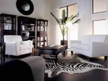 على خلفية أرضية أنيقة شبه لامعة باللونين الأسود والبني ، سيبرز الأثاث المنجد المصنوع من الجلد الكريمي الناعم بشكل مذهل. يجب أن تحيط هذه التفاصيل بالجدران البيضاء بمنافذ ذات حواف داكنة ولوحات جدارية كبيرة. طاولة صغيرة بنية اللون تجد مكانها مقابل الأثاث الكريمي..