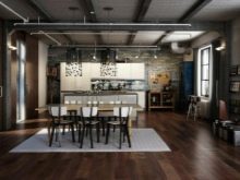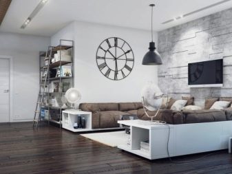 في مثل هذه البيئة ، ستبدو الأرضية المظلمة المصنوعة من البلاط اللامع أو نسخة خشبية خشنة ، بالإضافة إلى صفائح ذات لون رمادي-بني أو رمادي غامق ، عضوية. بالإضافة إلى ذلك ، يمكن أن تحاكي الأرضيات الحجر القديم البالي أو تكون مصنوعة من الخرسانة لمحاكاة ذراع التسوية غير المكتمل..