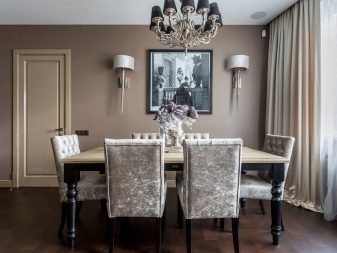 في مثل هذه المجموعات ، يوصى باستخدام أغطية الأرضيات الماهوجني الطبيعية الداكنة. لن تكون الإضافة على شكل سجادة جاكار فاخرة غير ضرورية..