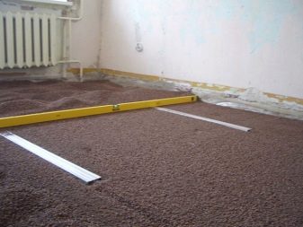 - من أجل أن يكون ذراع التسوية متساويًا ، يتم تثبيت المنارات. لهذا ، يتم تطبيق قاعدة شد الخليط السائب في الاتجاه نحو نفسه. في هذه الحالة ، تتاخم أطراف الجهاز ضد المنارات المجاورة. يتم سكب فتات الطين الموسع بين المنارات. يجب ألا تقل طبقة الطلاء عن 30 مم. لا ينصح بملء القاعدة بأجزاء كبيرة. يمكن أن يسبب هذا إزعاجًا أثناء العمل ، مما سيؤثر نتيجة لذلك على جودة النتيجة النهائية..