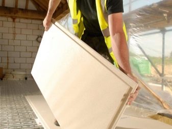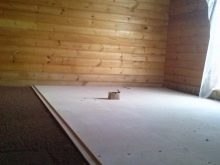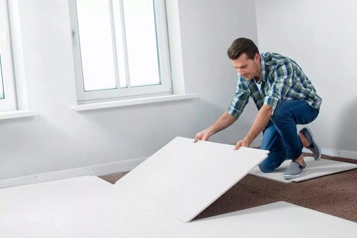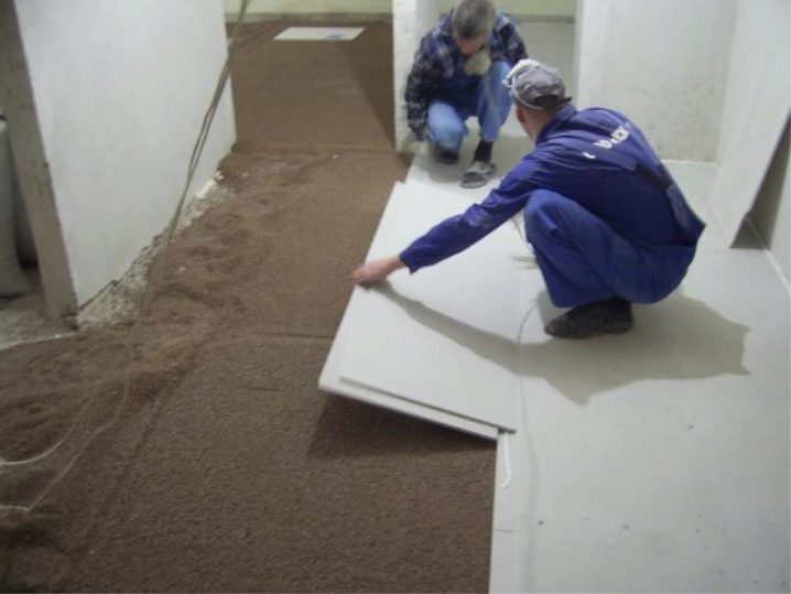 - بعد ذلك يتم العمل على وضع مادة الألياف الجبسية. يتم وضع الأوراق في صفوف ، مع لصق الطيات بمادة لاصقة خاصة. الأرضيات مصنوعة من الإزاحة. يبدأ العمل في القيادة من الجدار الأبعد إلى الباب الأمامي..