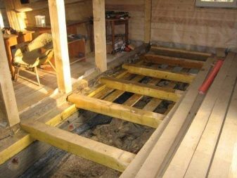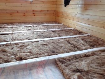 - بدون تفكيك غطاء الأرضية. يتم وضع جذوع الأشجار على الأرضية القديمة ، يوجد بينها عازل ويتم وضع غطاء أرضي جديد في الأعلى.