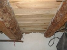 بعد ذلك ، يتم وضع السجلات. يجب عليك اختيار شعاع من الخشب الصنوبري ، الحد الأدنى من المقطع هو 50 * 50 مم. ومع ذلك ، إذا كانت أرضية الطابق السفلي معزولة وكان مطلوبًا عزل حراري مقوى ، فحينئذٍ ، وفقًا لذلك ، يلزم وجود شريط من قسم أكبر.