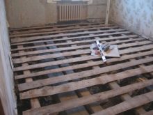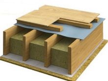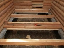 - بدون تفكيك غطاء الأرضية. يتم وضع جذوع الأشجار على الأرضية القديمة ، يوجد بينها عازل ويتم وضع غطاء أرضي جديد في الأعلى.