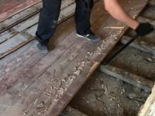 يستخدم بناة “المدرسة القديمة” فأسًا لتفكيك الألواح: يقومون بتثبيتها بعناية بين السجل واللوح ، دون إتلاف أحدهما أو الآخر ، وبتأثير بسيط يرفعون حافة اللوحة.
