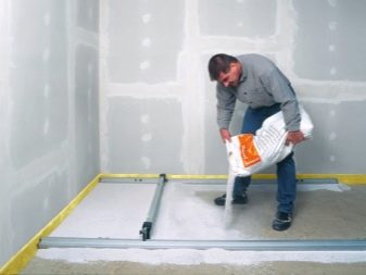 في المتاجر ، تُباع قدد التسوية على شكل أكياس مسحوق. هناك طلاءات نهائية وخشنة. أولاً ، تُخفف الطبقة الخشنة بالماء وفقًا للتعليمات وتُسكب وتجف. يتم بالفعل تطبيق لمسة نهائية رقيقة عليه. يتم إضافة مواد بلاستيكية وإضافات خاصة إلى الخليط لزيادة قوتها وتقليل وقت التجفيف.