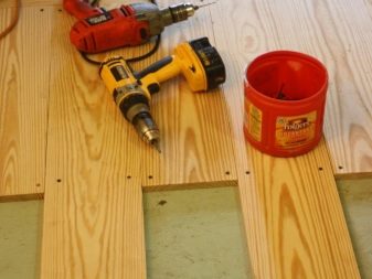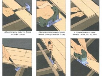 يمكنك إصلاح لوحة اللسان والأخدود بيديك – هذه تقنية موثوقة للغاية ، ولكنها ليست أنيقة للغاية. يتم دفع السحابات إلى الجانب الأمامي من اللوحة ، ويتم استخدام زوج من المسامير اللولبية على كل جانب ، ويجب الحفاظ على مسافة 50 مم من الحدود. إذا قمت بتثبيتها في الأخدود (عن طريق لف المسمار اللولبي في الجزء السفلي من الأخدود بزاوية 45 درجة) ، فسيتعين دفع القبعة إلى عمق الشجرة. فقط مثل هذه الحالة ستسمح لك بوضع الألواح التالية بهدوء. عيب هذا النهج البسيط الشامل هو خطر انقسام الألواح إذا كانت ملتوية.