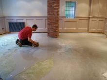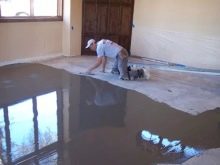 يُسكب المزيج السائل على المنطقة المحضرة بشكل متساوٍ ومستمر ؛ يجب أن يتم ذلك لمدة لا تزيد عن ساعة واحدة لتجنب تصلب المحلول. ثم تتم إزالة فقاعات الهواء من السطح باستخدام بكرة إبرة. بعد ذلك ، ينتقلون إلى عمل مماثل في القسم التالي..