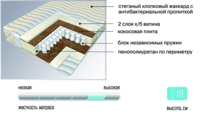 الحشو الطبيعي (صفيحة جوز الهند) يعطي المنتج الصلابة اللازمة ، والمادة الاصطناعية (هولوفيبر) – المرونة والراحة. هذه المواد هيبوالرجينيك ، صحية ، لأنها لا تمتص الرطوبة والروائح على الإطلاق ، فهي سهلة التجفيف. غطاء المرتبة مصنوع من نسيج قطني طبيعي.