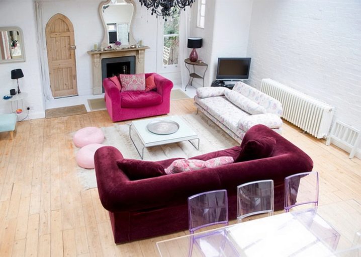 بالنسبة للغرفة الصغيرة ، فإن الأريكة المدمجة المستقيمة مناسبة. سيبدو الأثاث كبير الحجم في مثل هذه الغرفة في غير محله. خيار قوي وهائل مناسب لغرفة المعيشة الكبيرة..