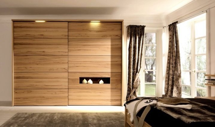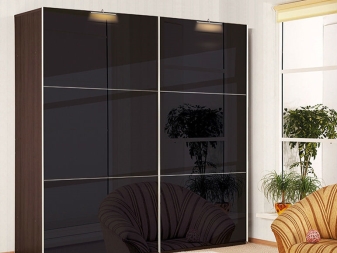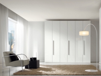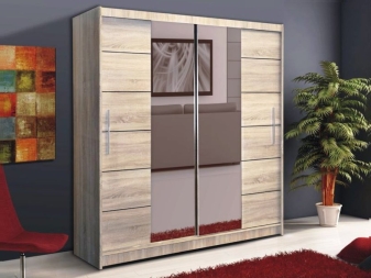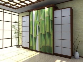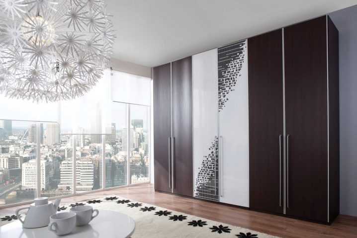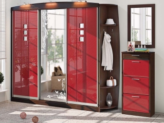 يستخدم الخشب الأملس للزينة ، كخيار – مع تشطيب لامع. الجزء الأمامي من الخزانة بلون واحد أو لونين ، متناقض. في كثير من الأحيان ، تستخدم المرايا الكبيرة على الواجهات لتوسيع المساحة. لا توجد أرفف مفتوحة أو أبواب زجاجية! يجب إخفاء كل شيء بأمان في تصميم داخلي بسيط..