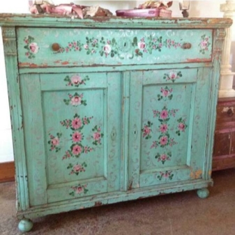 بالنسبة لغرفة المعيشة أو غرفة النوم ، يمكنك اختيار نموذج واسع إلى حد ما بواجهات فارغة ، ولكن دائمًا ما يكون مزينًا بنقوش ومقابض مزورة. ألوان الأثاث فاتحة: يفضل الأبيض والأزرق والفيروزي. النماذج ذات الزنجار مناسبة جدًا لهذا النمط..