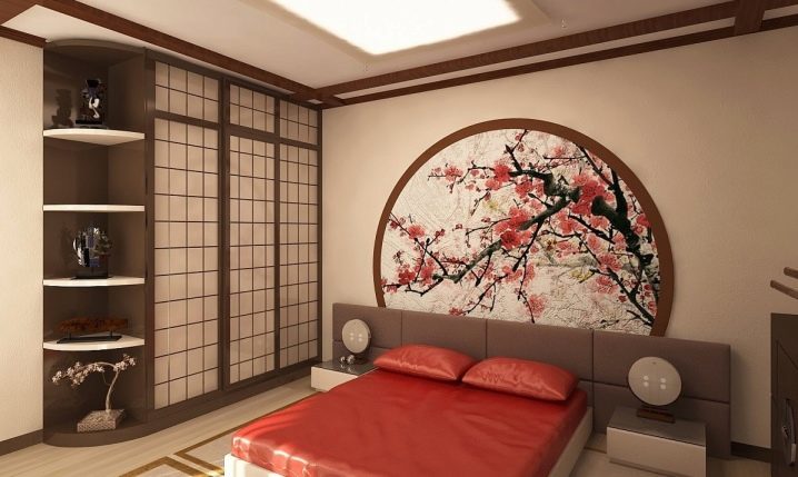خزانة ملابس حديثة تتناسب تمامًا مع غرفة النوم ذات الطراز الياباني. لها أرفف مفتوحة ومستديرة على جانب واحد وتقليد أوراق الأرز على الواجهات. يخفي هذا التصميم عمومًا حقيقة وجود خزانة في الغرفة. يتم إنشاء وهم جدار منزل ياباني تقليدي.