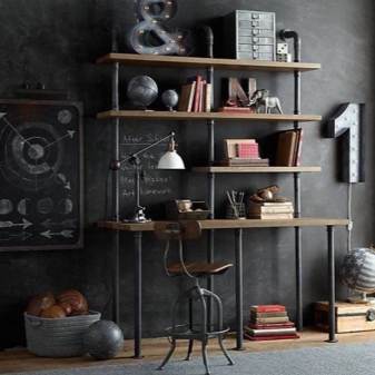 يمكن جعل التصميم الداخلي للطابق العلوي ، الذي هو عصري وشائع اليوم ، أكثر جاذبية من خلال وضع رف غير عادي بروح steampunk. الأنابيب والألواح البسيطة التي تعمل كأرفف على خلفية الجدران “العارية” لمساحة الدور العلوي ستبدو أكثر من منطقية.