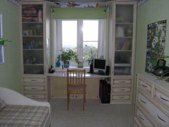 سيكون الخيار المثير للاهتمام والعملي والأصلي هو وضع المنتج حول النافذة. حتى تتمكن من توفير المساحة بشكل فعال ، وإنشاء تصميم غير عادي للغرفة. في الوقت نفسه ، يمكن وضع مكتب بجوار النافذة مباشرة ، حيث سيدرس الطفل. سيبدو تكوين خزانة الملابس والطاولة المدمجين أنيقًا للغاية. ستكتسب الغرفة الانسجام والتوازن في لحظة. في هذه الحالة ، من الأفضل وضع الخزانات على جانبي النافذة. قد تكون هناك أرفف في الأعلى والأسفل حيث يمكن وضع الأشياء الضرورية.