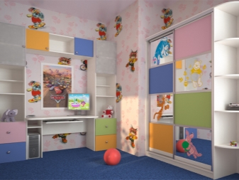 يمكن تنفيذ خيارات مماثلة إذا كانت الجدران في الغرفة سميكة للغاية. في هذه الحالة ، يمكنك قطع ثقب ومعالجة دواخله وتركيب الأبواب من الخارج. بهذه السهولة والبساطة سيكون لديك خزانة ملابس أطفال واسعة. في الوقت نفسه ، يمكنك أنت بنفسك اختيار المحتوى وإنشاء تصميم إبداعي لمثل هذا الأثاث. لا تنس التشاور مع طفلك.