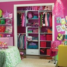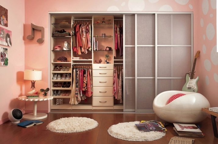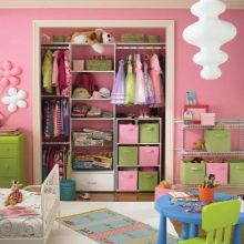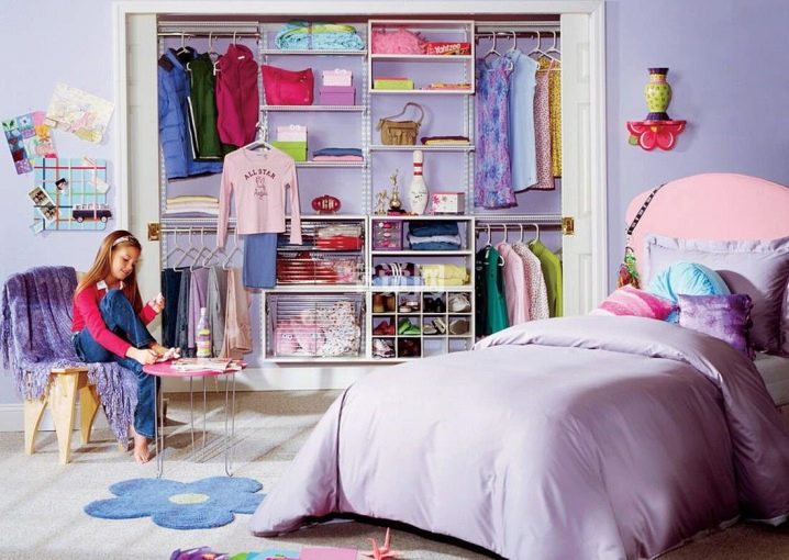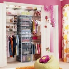 توجد قضبان وضع الشماعات مع الأخذ في الاعتبار حقيقة أن الطفل سوف يكبر ، وبالتالي ، يجب تعليق الأشياء أعلى وأعلى. على ارتفاع منخفض ، تم تجهيز خزانة الملابس بحجرات للملابس المطلوبة يوميًا.
