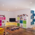 يمكنك أيضًا إنشاء مكان للألعاب بنفسك: فقط قم بطلاء أي خزانة بألوان أكثر سطوعًا ، دون أن تنسى الأرفف ، يجب أيضًا طلاءها ، ثم استبدل المقابض بأخرى أكثر تشويقًا..