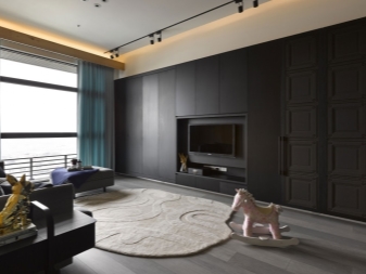 نظرًا لأن الخزانة ستشغل الجدار بالكامل ، فسيتم تركيز كل الاهتمام الرئيسي عليه. هذا يعني أنه يجب إخفاؤه خلف أبواب منزلقة مزينة بنمط مثير للاهتمام ، أو أن يكون به أرفف مفتوحة حيث يمكنك ترتيب التفاصيل الزخرفية أو تثبيت المعدات التي تحتاجها..
