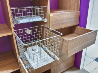 - سلال. الصناديق على شكل سلال شبكية ضرورية للملابس أو الأحذية المطوية. بفضل مادة الشبكة ، تكون المحتويات مرئية بوضوح ، وتساهم هذه المادة أيضًا في التهوية. السلال مجهزة ببكرات لسهولة السحب.