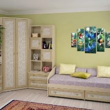 - أطفال. بالنسبة لغرفة الأطفال ، يعد استخدام خزانة زاوية صغيرة أمرًا بالغ الأهمية. بعد كل شيء ، من الضروري تخصيص مساحة أكبر للألعاب والرياضة. نموذج شبه منحرف واسع مع أرفف إضافية مناسب هنا. سيحافظ الساكن الصغير في الغرفة على النظام بوضع ألعابه هناك. وسيتم استخدام المقصورات العلوية لتخزين الملابس وأغطية السرير..