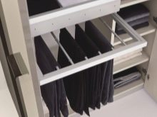 بنطلون نسائي بإبزيم جانبي بمسامير تشغل مساحة صغيرة ، تاركة وسط الخزانة مجانًا. يسمح لك هذا النظام بتخزين ما يصل إلى 8-9 أزواج من البنطلونات. آلية التثبيت والقضيب نفسه مصنوعان من الفولاذ ، مما يزيد من موثوقيتها. في الوقت نفسه ، يجب ألا يقل عمق الخزانة عن 60 سم ، يتم تقديم هذا النوع من التصميم أيضًا في إصدار مضغوط ، حيث لا يمكنك تعليق البنطلون فحسب ، بل أيضًا ربطات العنق والتنانير على عنصر السحب ، ربطها بمشابك الغسيل.