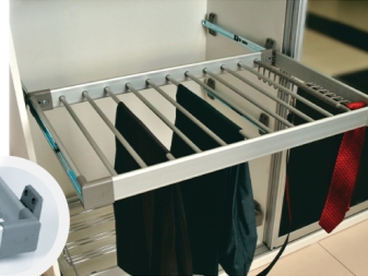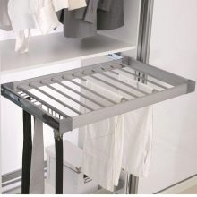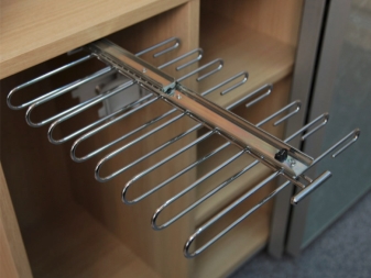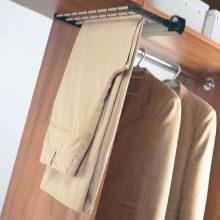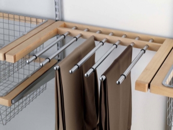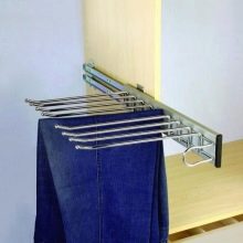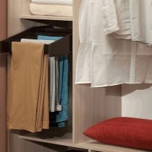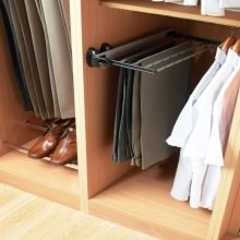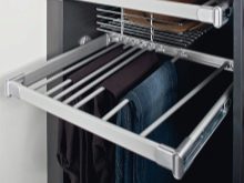 بنطلون نسائي بإبزيم جانبي بمسامير تشغل مساحة صغيرة ، تاركة وسط الخزانة مجانًا. يسمح لك هذا النظام بتخزين ما يصل إلى 8-9 أزواج من البنطلونات. آلية التثبيت والقضيب نفسه مصنوعان من الفولاذ ، مما يزيد من موثوقيتها. في الوقت نفسه ، يجب ألا يقل عمق الخزانة عن 60 سم ، يتم تقديم هذا النوع من التصميم أيضًا في إصدار مضغوط ، حيث لا يمكنك تعليق البنطلون فحسب ، بل أيضًا ربطات العنق والتنانير على عنصر السحب ، ربطها بمشابك الغسيل.