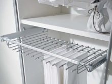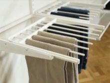 تنصح ربات البيوت من ذوي الخبرة بإصلاح البنطلونات على مسافة لا تقل عن 60 سم من الرف السفلي للخزانة ، حتى لا تتجعد أرضيات المنتج ولن تجمع الغبار. لا تخف من أن البنطال المصنوع من قماش خفيف الوزن سينزلق عن العارضة – القضبان لها سطح مخدد ومجهزة بالإضافة إلى الثنيات. يساعد هذا النظام على توفير مساحة في الخزانة والحفاظ على النظام ويوفر بحثًا سريعًا عن الشيء الصحيح..