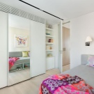 يمكنك أيضًا وضع خزانة ملابس مدمجة بالقرب من الباب الأمامي. وبالتالي ، فإن مساحة التخزين ستؤطر مدخل الغرفة. لكن ضع في اعتبارك أن الأرفف يجب أن تكون ضحلة..