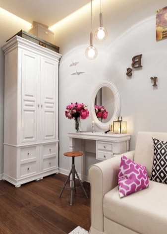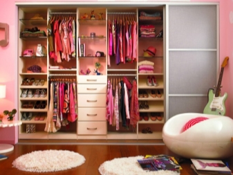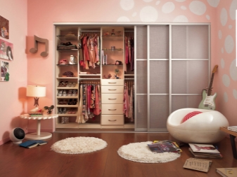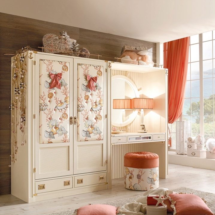 من الممكن أن تكون خزانة الملابس المستقلة خزانة ملابس فقط. مع وجود مساحة كافية في الغرفة ، اصنع خزانة ملابس للفتاة فقط لتخزين الفساتين ، وخذ الأدراج السفلية للإكسسوارات.