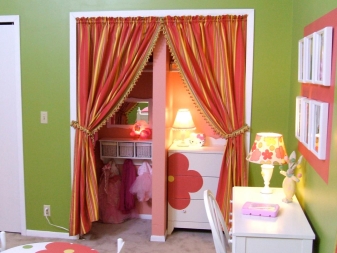 إذا كانت خزانة الملابس مدمجة في مكان مناسب ، فيمكن أن تبدو وكأنها خزانة ملابس منفصلة أو مخزن. على نحو متزايد ، يفضل الآباء تغطية منطقة التخزين هذه بالستائر. إنه ليس مريحًا فحسب ولكنه أنيق للغاية أيضًا. اختر الألوان الفاتحة مثل اللون الوردي الباهت أو الأصفر الباهت. ومع ذلك ، إذا كان الطفل صغيرًا جدًا ، فاختر أبوابًا للأمان..