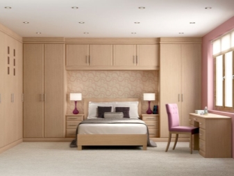 يمكن وضع خزانة الملابس المدمجة ليس فقط في مكان مناسب ، ولكن أيضًا حول رأس السرير. يبدو خيار التنسيب هذا أصليًا جدًا. إذا كان سرير الفتاة في منتصف الغرفة ، فاجعله محاطًا بخزانتين مدمجتين من الأرض إلى السقف على كلا الجانبين ، متصلة من أعلى برف واحد أو طابق نصفي. وبالتالي ، في غرفة مربعة ، سيتم تحرير كل المساحة المقابلة للسرير..