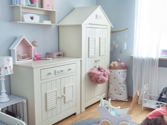 لكي لا تبدو قطعة الأثاث الكبيرة سخيفة في غرفة الأطفال الصغيرة ، فإن الأمر يستحق اختيار الألوان الفاتحة. لتوفير المساحة وللحفاظ على السلامة ، يتخلى مصنعو الخزائن بشكل متزايد عن التركيبات ، ويفضلون الفتحات في الأبواب والأدراج..