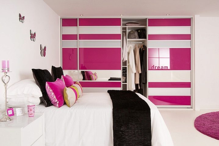 - الفوشيه الساطع ، الأسود ، الأبيض الثلجي. بالنسبة لفتاة مراهقة ، اختر سطح خزانة فوشيا لامع جميل. سيؤدي الجمع بين الأسود والأبيض إلى تخفيف السطوع ، وستبدو الغرفة أنيقة وعصرية للغاية ؛