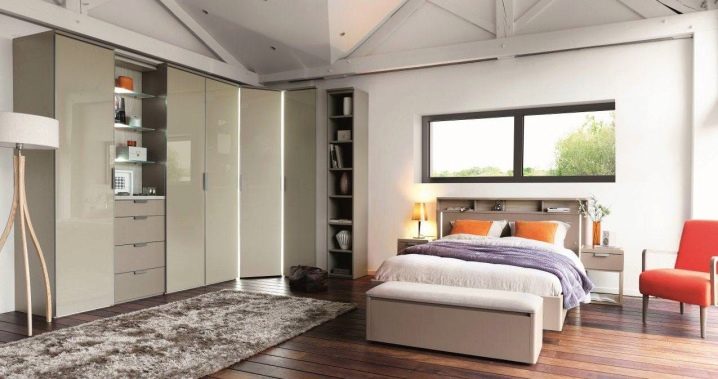 تبدو الخزانة المائلة أو الزاوية مثيرة للاهتمام أيضًا. يشغل هذا التصميم مساحة كبيرة ، لذلك تحتاج إلى تثبيته في غرف واسعة. يمكن أن تكون خزانة الملابس من هذا النوع ذات أربعة أبواب أو ثلاثة أبواب مع أدراج. يمكن استخدامه لتخزين الملابس التي ترتديها بنشاط ولتخزين العناصر خارج الموسم..