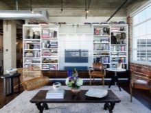 يمكن تركيب خزانة كتب أنيقة على طراز الدور العلوي في غرفة المعيشة. لن يصبح هذا الأثاث تخزينًا جيدًا لكتبك فحسب ، بل سيكون أيضًا إضافة أنيقة للداخل. يمكن تزيين عرضه بجميع أنواع الهدايا التذكارية والتماثيل والتفاصيل الأخرى..