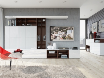 يمكن أن تتكون الخزانة العريضة التي تشغل نصف جدار من مواد مختلفة. على سبيل المثال ، غالبًا ما تُستكمل القاعدة المعدنية بأرفف خشبية أو شبكات معدنية. تبدو أنيقة ومثيرة للاهتمام..